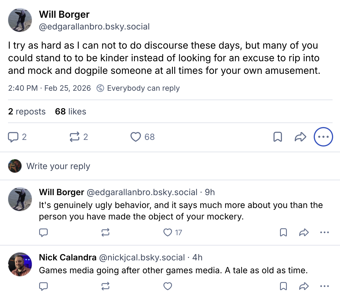 It’s quite amusing that after writing my original thread with thoughts on this, I happen to see Will Borger’s post and Nick Calandra’s subsequent reply vague-posting about some sort of games media drama.